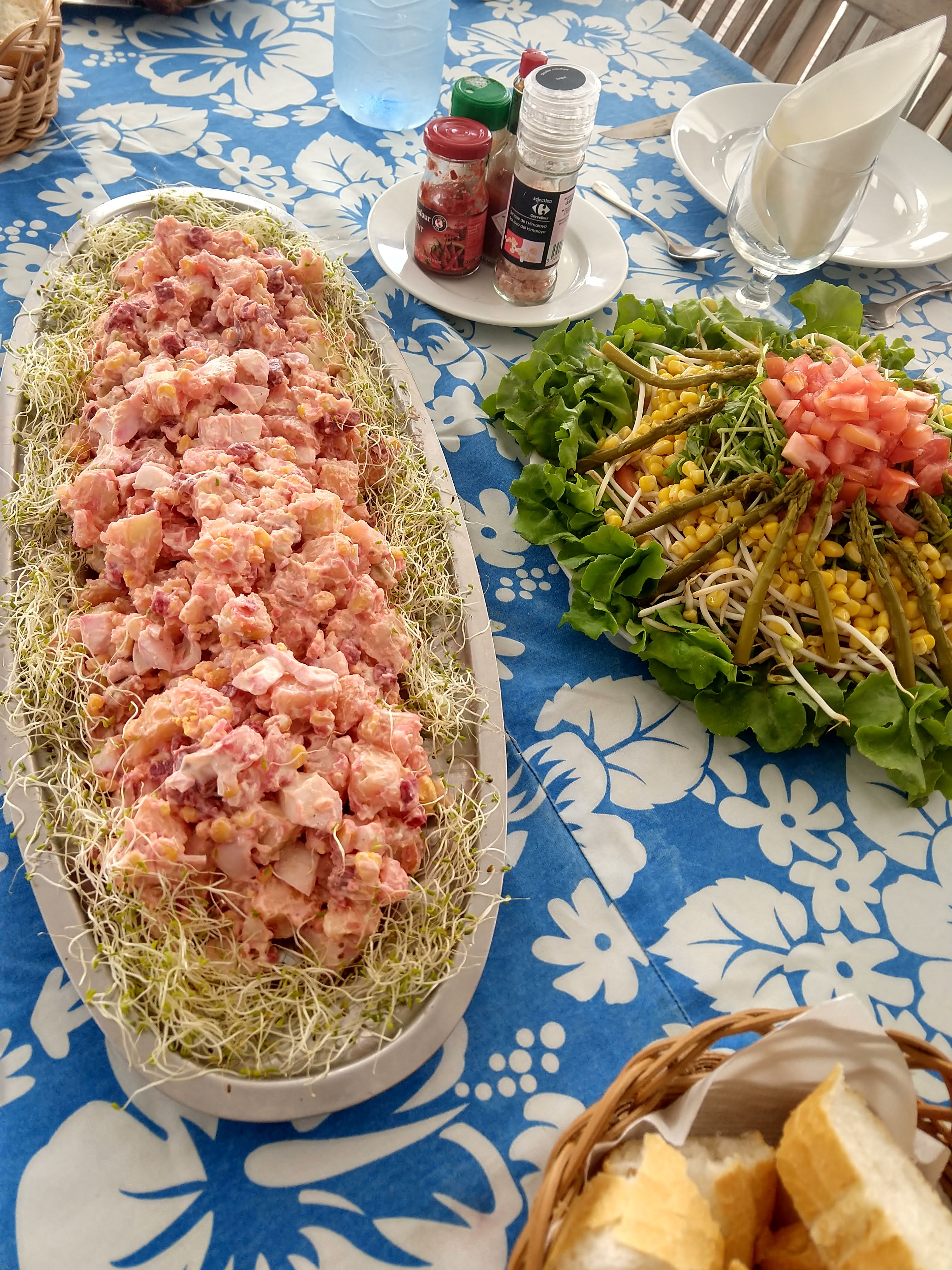 Another boat meal: Russian (Olivier) Salad consists of potato, egg, beet, corn, and a mayonnaise dressing. I’ll be making this at home, knowing the veggies can be varied. Served with green salad, roasted chicken thighs and drums, and the ubiquitous baguette (served at every meal). Not pictured is the dessert of waffles with nutella, whipped cream, and bananas that had everyone groaning in happiness.