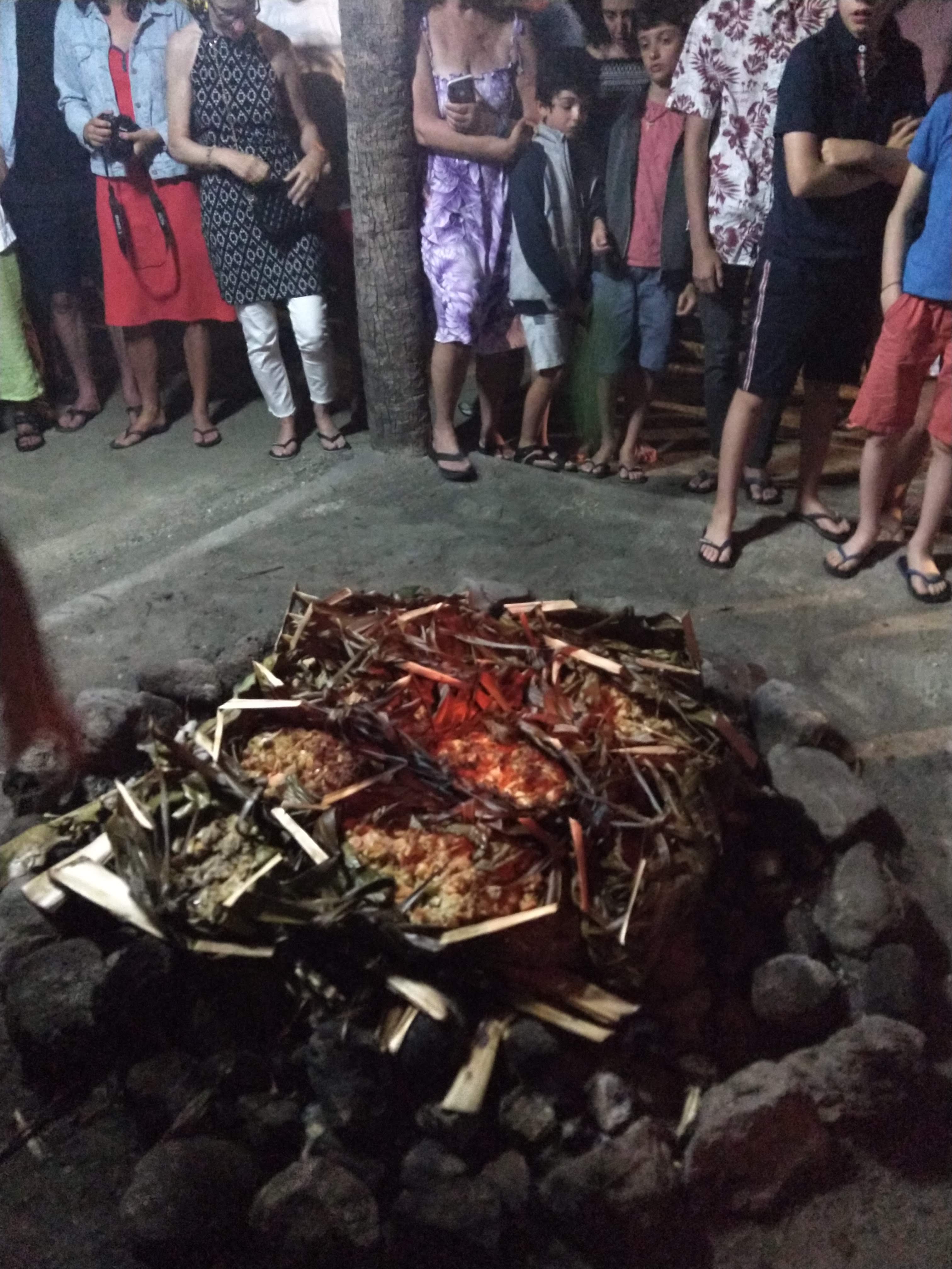 Other than the poisson cru and the rice, everything was cooked in the ahima’a. The beef was bland, but the curried fish was good, and the chicken fa fa (with spinach and coconut cream) was great. The orange gelatinous stuff on the right is poi, made from taro. It was fine. Not horrible, not great, just underwhelming.