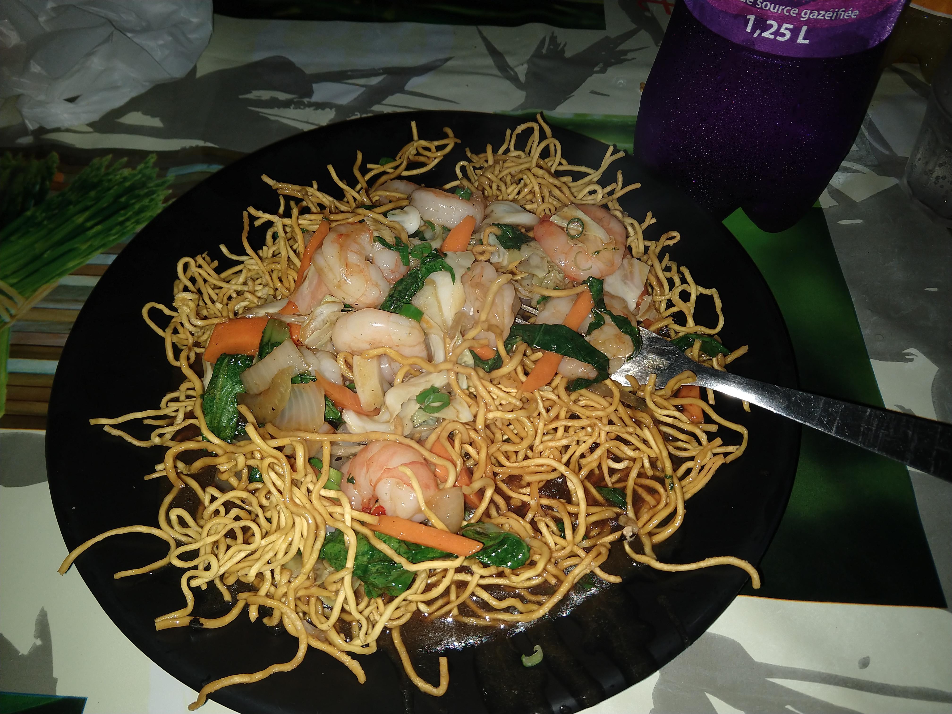shrimp curry over chow mien noodles