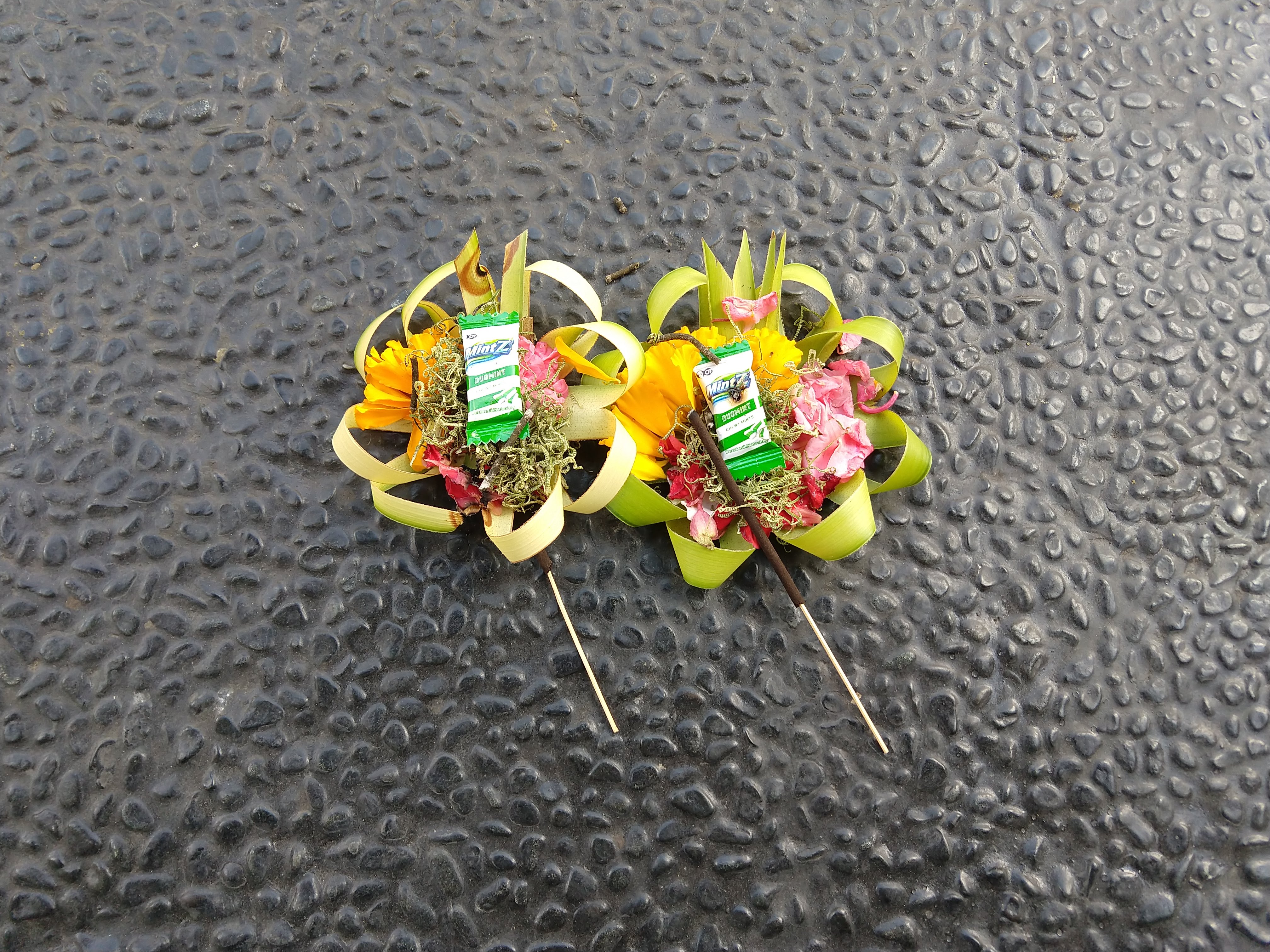 These little offerings are every few feet, especially on the ground. Canang sari are expressions of gratitude traditionally offered three times daily.