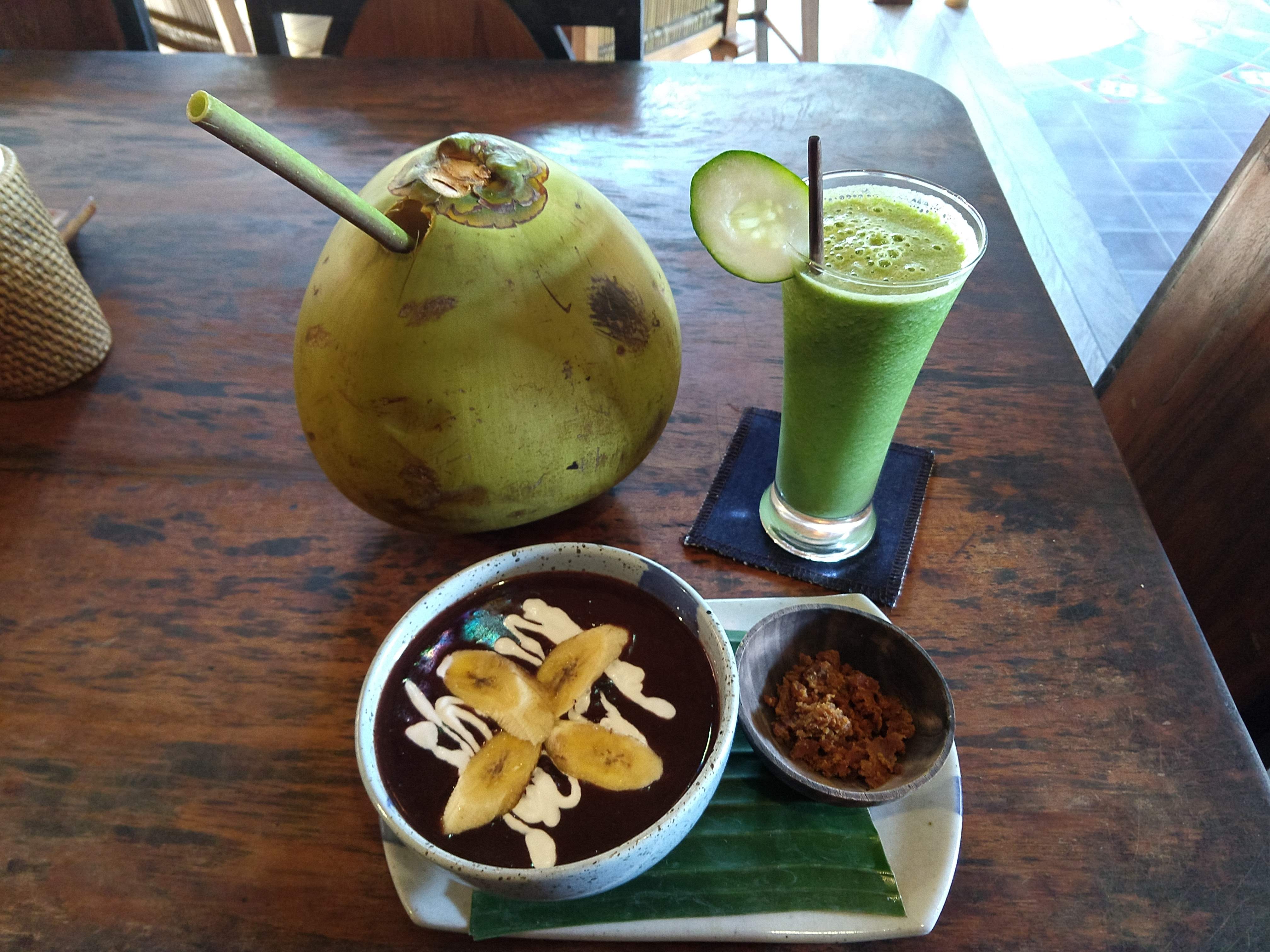 Healthy Yoga Barn breakfasts: coconut water, green smoothie, and black rice pudding.