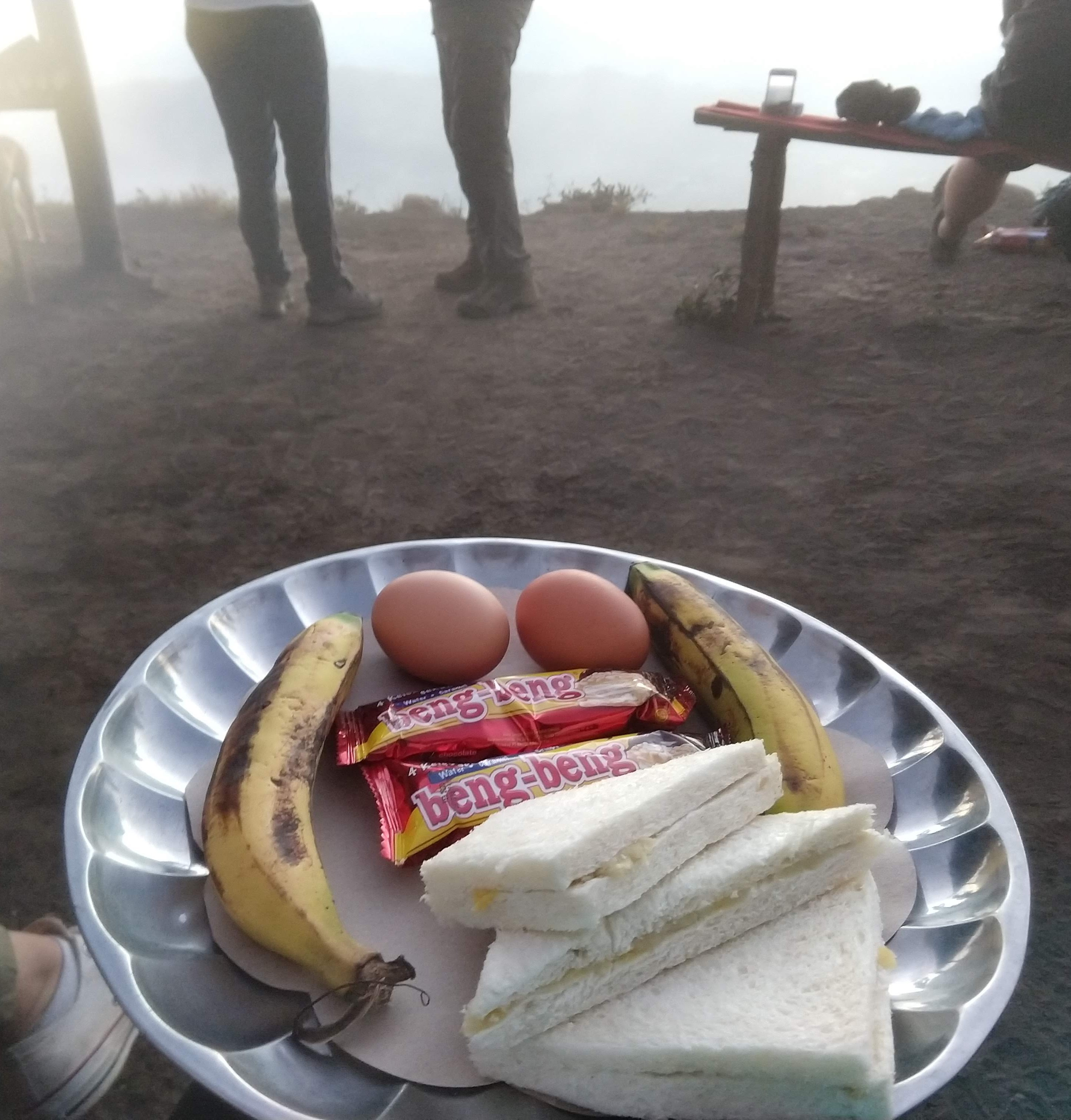 Mt. Batur summit breakfast included banana sandwiches and hard boiled eggs.